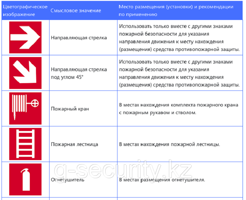 Задача сигнальных табличек — сообщить человеку о местонахождении полезных при пожаре вещей: огнетушителя, телефона, кнопки пожарной тревоги, пожарного крана, охранного извещателя и так далее. Эти таблички всегда квадратные, а изображения на них рисуются белым по красному. В некоторых случаях (например, на знаке пожарного гидранта) фон белый, а изображение и рамка — красные. На самом знаке изображается искомый предмет и/или стрелка, указывающая в его направлении.